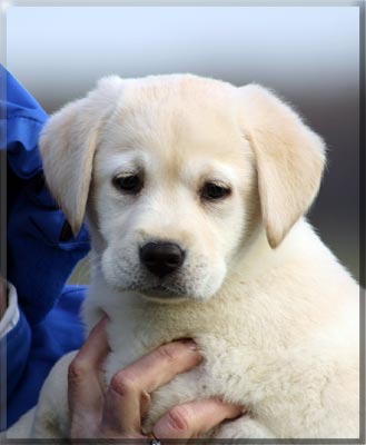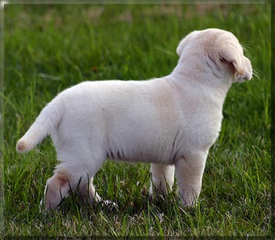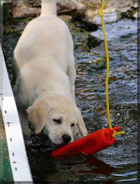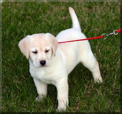 At 7 weeks, Annie's early leash lessons. "oh, woe is me!" "It's a jungle out there!" Our Pretty Annie Too tired to walk any more, our spoiled baby gets carried. Not the dreaded leash again!!!! Annie's first dip in the Bay of Quinte. She loves her baby sized dummy.