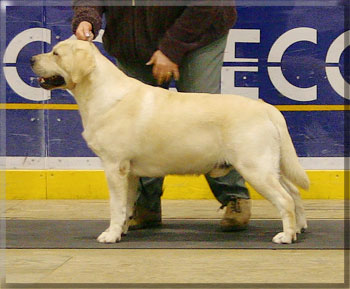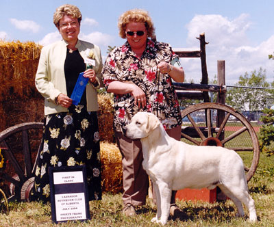 | McDuff won 1st in Sr. Puppy Male at both the LRCA and LRCC Specialties, under Sally Bell. (Borador) and Guy Spagnolo, (Driftway) Pictured with judge Sally Bell. Age 11 months | McDuff winning Best of Breed and a Group 4th at Belleville Kennel Club shows. Age 14 months. |